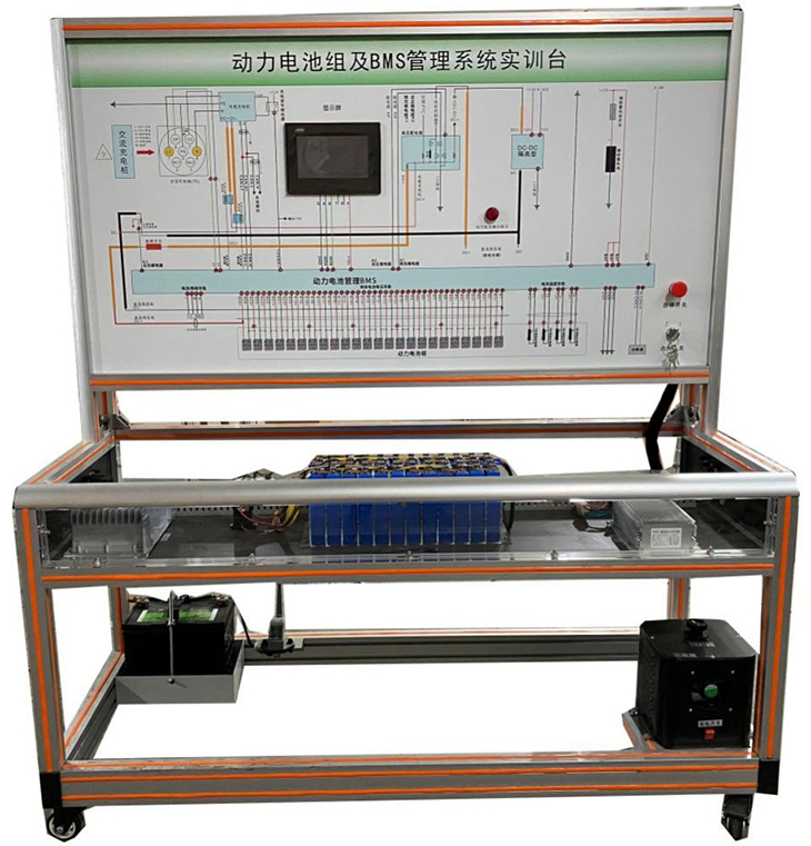 磷酸鐵鋰動力電池包,BMS鋰電管理一體機,動力電池包觸摸顯示屏,充電機,國標充電插口,國標充電槍,緊急斷電開關(guān),霍爾電流傳感器,直流接觸器,DC-DC轉(zhuǎn)換器,輔助蓄電池,放電控制繼電器與放電負載,電阻,可移動實訓(xùn)臺(帶檢測端子的原理面板)。