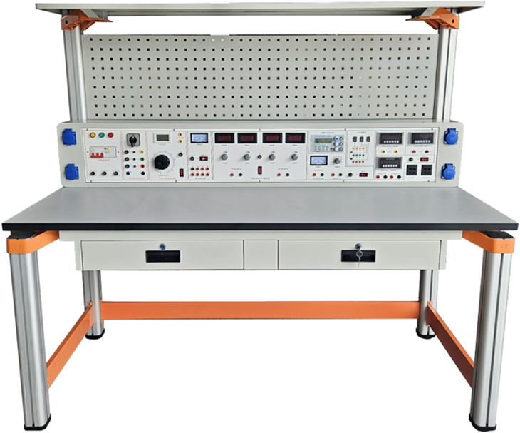 實訓桌后面二支截面尺寸70×70mm桌腳向上延伸,與一次成型鋁壓鑄框架連接構件構成(非焊接工藝)牢固的支架,與網(wǎng)孔工具掛板、儀器架、電源控制箱組成一個完整的實訓屏。