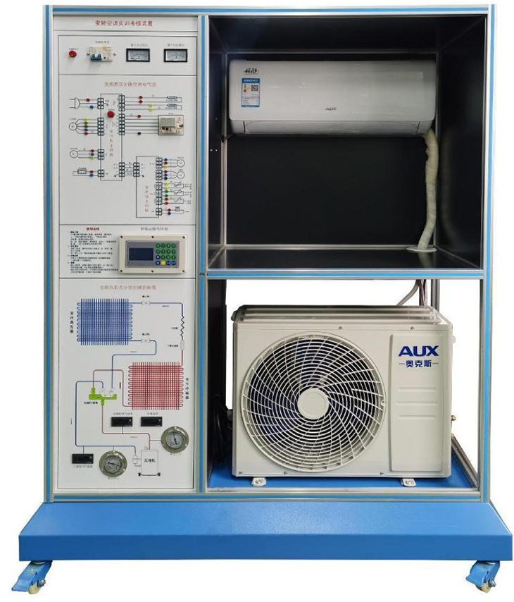 實訓裝置由控制屏、實訓桌、空調室外機組、空調室內機組、測量儀表、模擬故障檢測單元、模擬故障箱等組成