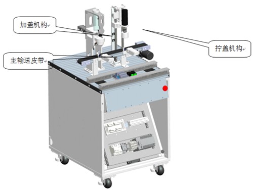接收上一工作站填裝好顆粒的瓶子,當(dāng)瓶子被輸送到加蓋機(jī)構(gòu)后,主輸送皮帶停止,夾蓋定位夾緊機(jī)構(gòu)將瓶子固定,加蓋機(jī)構(gòu)啟動加蓋流程,將蓋子加到瓶子上;加好蓋子后主輸送皮帶啟動,加上蓋子的瓶子繼續(xù)被送往擰蓋機(jī)構(gòu),到擰蓋機(jī)構(gòu)下方,主輸送皮帶停止,擰蓋定位夾緊機(jī)構(gòu)將瓶子固定,擰蓋機(jī)構(gòu)啟動,將瓶蓋擰緊,主輸送皮帶啟動,將擰好蓋子的物料瓶輸送到下一工位。瓶蓋分為白色和黑色兩種。