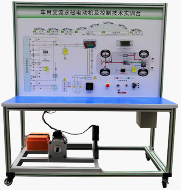 檢測控制面板(裝有各種檢測端子,1448×940mm彩色電路圖和工作原理示意圖)、組合儀表、點火開關(guān)、電機控制器、車載充電器與充電接口、DC-DC轉(zhuǎn)換器、鋰動力電池組、電動車電機(永磁同步電機)、剎車開關(guān)、檔位開關(guān)、油門控制裝置、大電流繼電器、電源總開關(guān)、急停開關(guān)、輔助蓄電池(12V45AH)、一體化全鋁合金型材搭建的移動臺架(1500×700×1700mm