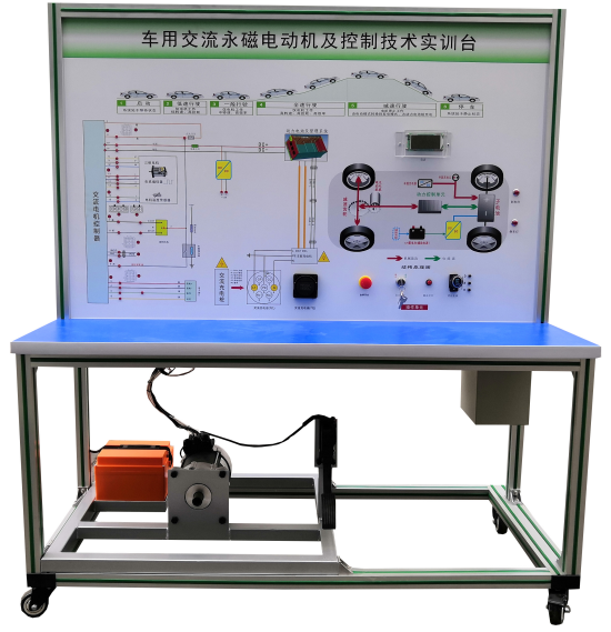 檢測控制面板(裝有各種檢測端子,1448×940mm彩色電路圖和工作原理示意圖)、組合儀表、點火開關(guān)、電機控制器、車載充電器與充電接口、DC-DC轉(zhuǎn)換器、鋰動力電池組、電動車電機(永磁同步電機)、剎車開關(guān)、檔位開關(guān)、油門控制裝置、大電流繼電器、電源總開關(guān)、急停開關(guān)、輔助蓄電池(12V45AH)、一體化全鋁合金型材搭建的移動臺架(1500×700×1700mm