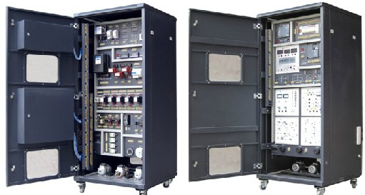 該種維修電工教學(xué)柜式實(shí)訓(xùn)考核裝置,包括有柜架、觀察窗、儀表操作盤、電氣系統(tǒng)、電機(jī)機(jī)組組成,所說的電氣系統(tǒng)由多個(gè)部分前后面板縱向展開排列,包括觸摸屏部分、PLC主機(jī)部分、變頻器部分、電力電子部分、直流電源部分、電力拖動(dòng)與繼電控制部分,電機(jī)軸功率、力矩、轉(zhuǎn)速測量部分,交直流電壓、電流,單三相交流電能、交流功率、功率因數(shù)測量部分等組成。