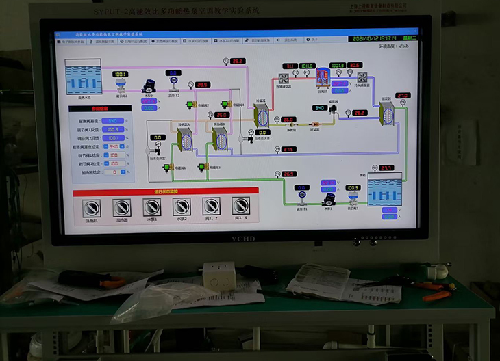*14、50寸高精度觸摸屏一體機及控制開發(fā)軟件,可進(jìn)行教學(xué)演示和實驗?zāi)J娇刂,并實時顯示系統(tǒng)溫度、壓力、差壓、流量、功率等數(shù)據(jù),計算系統(tǒng)能效比和制熱量等參數(shù)。