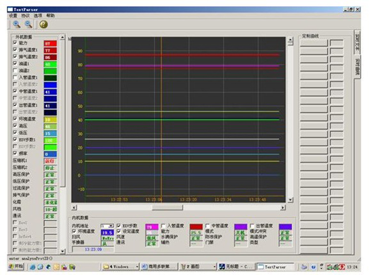 2)、軟件控制,能在線控制系統(tǒng)的溫度,讀取機(jī)組在最佳溫度系統(tǒng)制冷冷媒的流量開度數(shù),調(diào)整制冷機(jī)組的過熱度,過冷度。該文本顯示界面的左側(cè),以文本的形式實(shí)時顯示當(dāng)前機(jī)組的運(yùn)行數(shù)據(jù)。在界面右側(cè)的上半部分,是對通訊信息的顯示,包括通訊角色及通訊端口的設(shè)定值以及對當(dāng)前通訊狀態(tài)的顯示。在界面右側(cè)的下半部分"數(shù)據(jù)信息"中,顯示當(dāng)前接收到哪種數(shù)據(jù)幀、接收到的數(shù)據(jù)幀的地址、等信息。具有上位機(jī)調(diào)節(jié)的線上和手動調(diào)節(jié)功能: