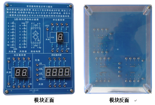 展示共陰及共陽數(shù)碼管的結(jié)構(gòu)示意圖及常用數(shù)字的數(shù)碼顯示方法,展示了單位數(shù)碼管、雙位數(shù)碼管、四位數(shù)碼管的實物并提供了可供檢測的臺階插座(內(nèi)孔2MM)。