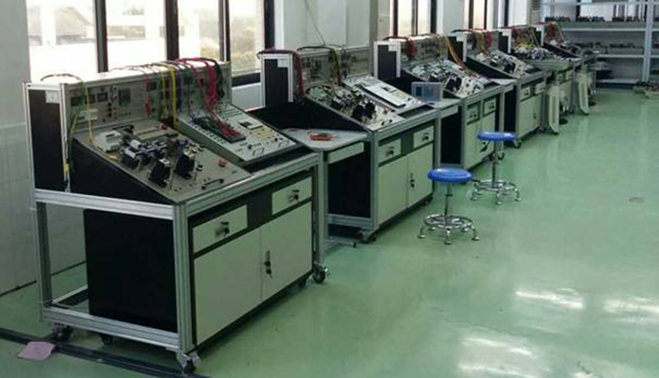 主控屏為鐵質(zhì)雙層亞光密紋噴塑結(jié)構(gòu),鋁質(zhì)面板。整個(gè)實(shí)訓(xùn)室配備一臺(tái)總電源控制柜,可以分控到下面每一臺(tái)設(shè)備的電源。