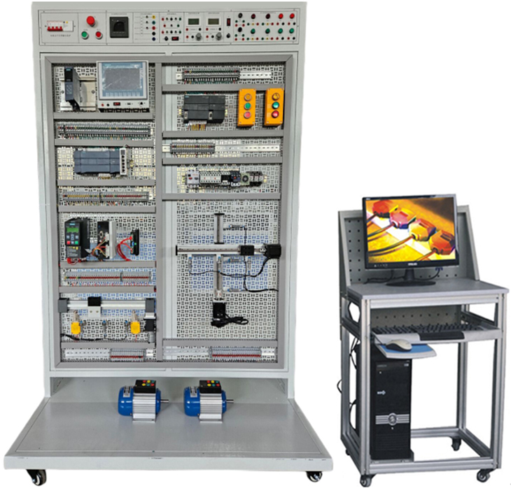 采用模塊組合式結(jié)構(gòu),含開關(guān)量、模擬量、變頻調(diào)速、觸摸屏、通信模塊等,配套MCGS工控組態(tài)監(jiān)控軟件,實(shí)現(xiàn)仿真化、信息化實(shí)訓(xùn)教學(xué)。