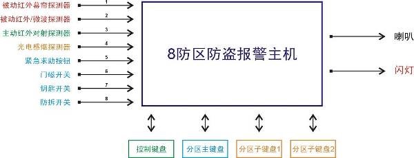 用戶與報警系統(tǒng)間的通訊界面。用戶可通過鍵盤發(fā)布指令;鍵盤則在用戶的整個操作過程中提供可視顯示和有聲提示。帶標有數(shù)字的防區(qū)指示燈,用于顯示各個防區(qū)的狀態(tài) |