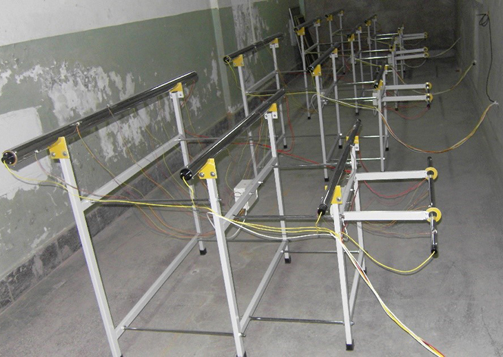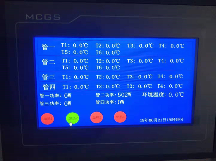 配有四根不同長度和直徑的電鍍紫銅管,管內(nèi)設置電加熱器;每根管子的表面裝4~6支測溫傳感器,以測定其表面平均溫度,測溫傳感器采用進口DS18B20;每根橫管電加熱器配備電子集成固體調(diào)壓模塊無機調(diào)節(jié)。測試儀表箱設有(每根橫管電加熱器)數(shù)顯功率表;所有測試數(shù)據(jù)由7寸觸摸屏同屏顯示,不銹鋼實驗支架。