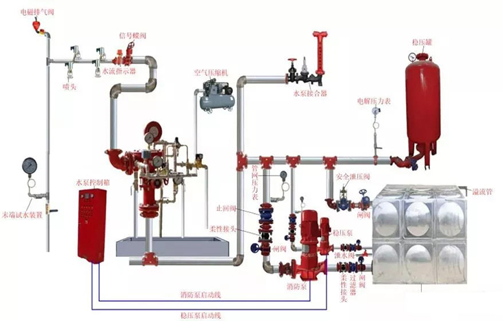 干式系統(tǒng)的基本構(gòu)成條件包括水源、加壓與穩(wěn)壓設(shè)施、壓力氣源、報警裝置、管網(wǎng)及閉式噴頭等部分。